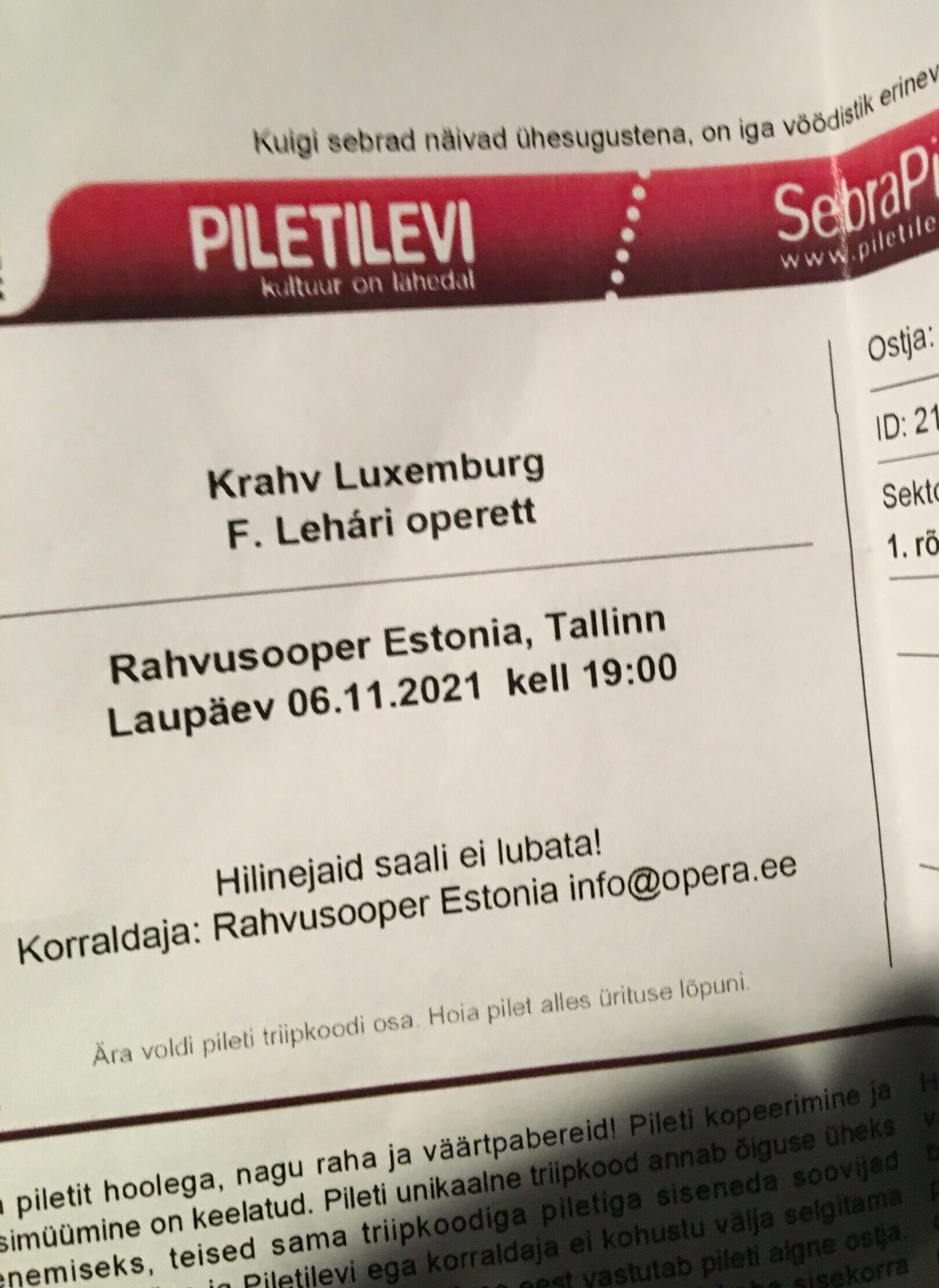 Novembri esimesel nädalal käisime rahvusooperis Estonia Franz Lehári operetti “Krahv Luxemburg” vaatamas (hinnainfo: sissepääs ühele 38.90 EUR). Selle lavastajaks ja kunstnikuks on Thomas Mika ning krahvi rolli täitis imeline Reigo Tamm. Reigo on paljudele kindlasti tuttav ka sarjast “Alo”, kus ta mängis Reinu poega Ahtit. Saal oli rahvast puupüsti täis ning õhtu oli väga tore! Kuigi ma pole just suurim operettide fänn, pean tunnistama, et see oli täitsa 5+.