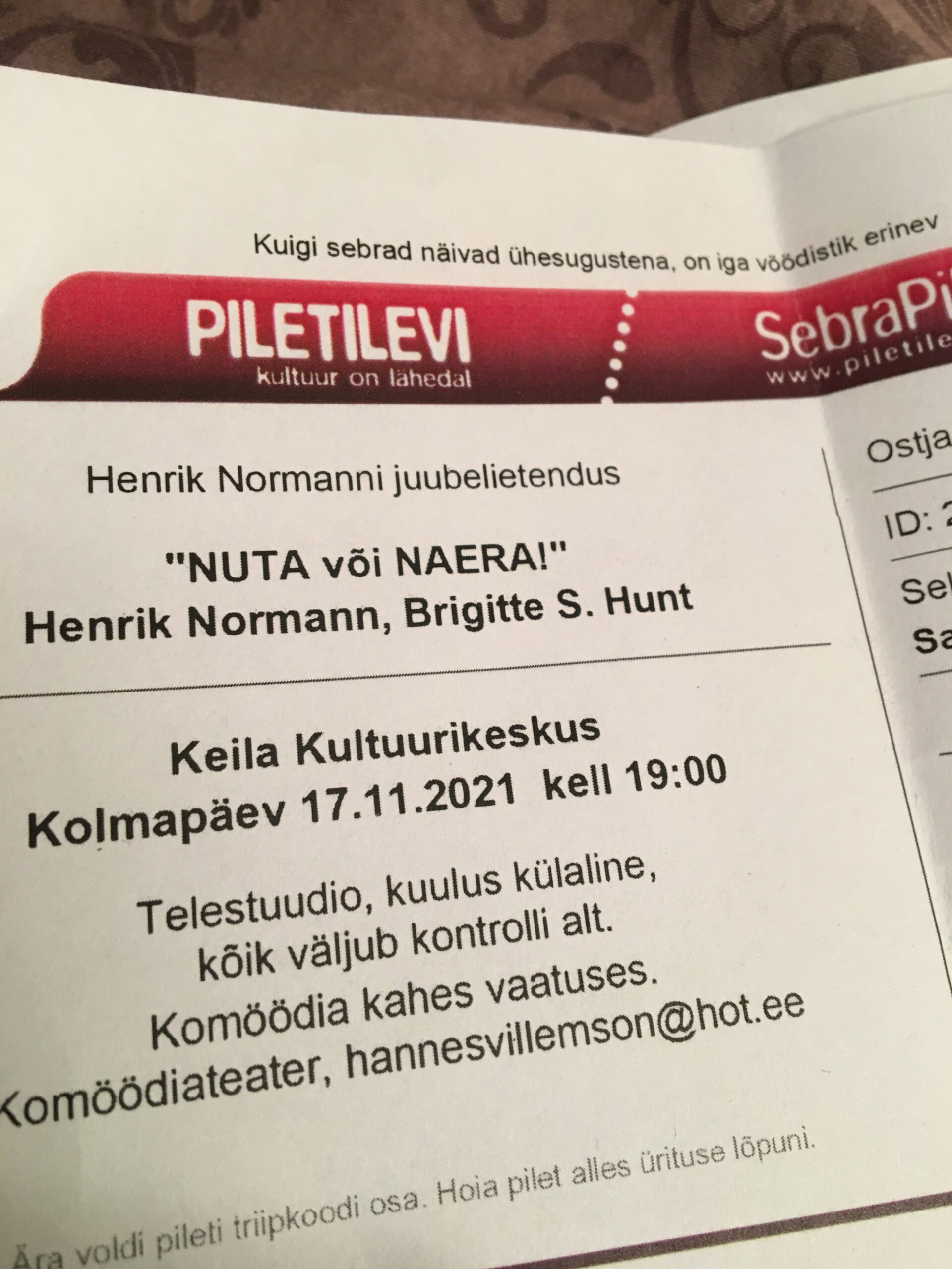 Kultuurisündmusi tuleb uksest ja aknast. Kolmapäevaks planeerisime Keila Kutuurimajas toimuva Henrik Normanni juubelietenduse “NUTA või NAERA” (pileti hind per face 21.90 EUR), kus ta astus lavale koos särava Brigitte Susanne Hundiga. Brigitte on peaaegu nagu noor Anu Saagim… tegelikult ei tea, kas nii on õige öelda, sest Anu Saagim näeb aastaid mitte vanem kui 35 välja ning teda bravuuriga ületada tegelikult vist keegi ei suuda. Okei, see selleks. Mõte on selles, et Brigitte on tubli ja hakkaja ning väga lahe ja isegi inspireeriv on vaadata, kuidas ta jõudsalt meelelahtusmaastikul möllab ning enesekindlalt oma rida ajab. Ja Normann on tõesti tunnustust väärt! Vahel on küll olnud tunne, et ta ei suuda oma Maie-rollist välja tulla aga see on pigem selline kõrvaline hädaldamine minu poolt. Komöödia on erinevatest žanritest kõige raskem. Püüdke te häid nalju välja mõelda ja aastaid rahvast naerutada.. Pole kerge. Väga sõbralik õhkkond oli üritusel ning tore õhtu oli. Muuseas, kõigile Normanni fännidele soovitan tema värskelt ilmunud raamatut: “Tee nalja, Normann“!