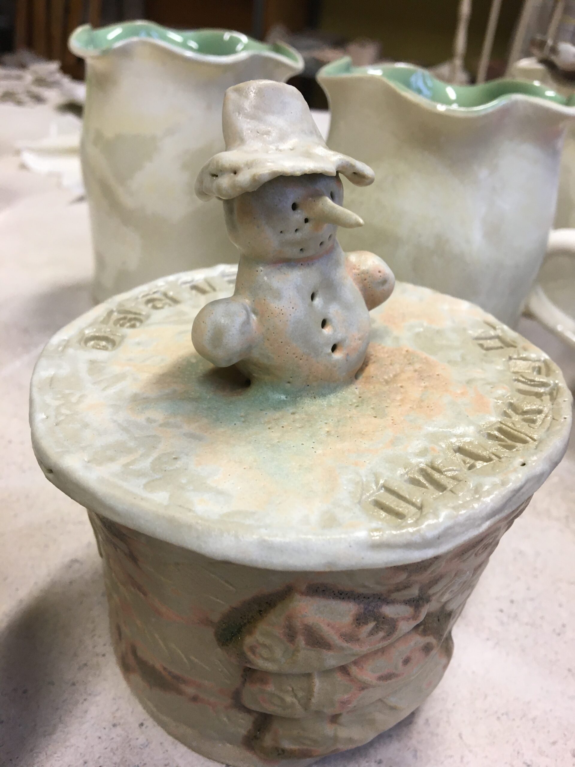 Ivanka Shoshana teeb nii ilusat keraamikat ning pole midagi südant soojendavat kui enda valmistatud kingitus! Mulle on tema stiil ning julge ja vaba käega loodud savinõud alati meeldinud. Ta leiutab aina uusi ja huvitavaid asju – viimane hitt on nõud, mille kaant ehib suur lumememm või mõni muu vahva tema loodud tegelane. Super hea idee! Sellel aastal on ta teinud seitse sellist eksklusiivset nõud, mitmed spetsiaalse pühendusega. Tema tehtud lumememme nupuga anumad läksid nii popiks, et keraamikaringis hakati neid massiliselt järgi tegema. How cool is that? 🙂