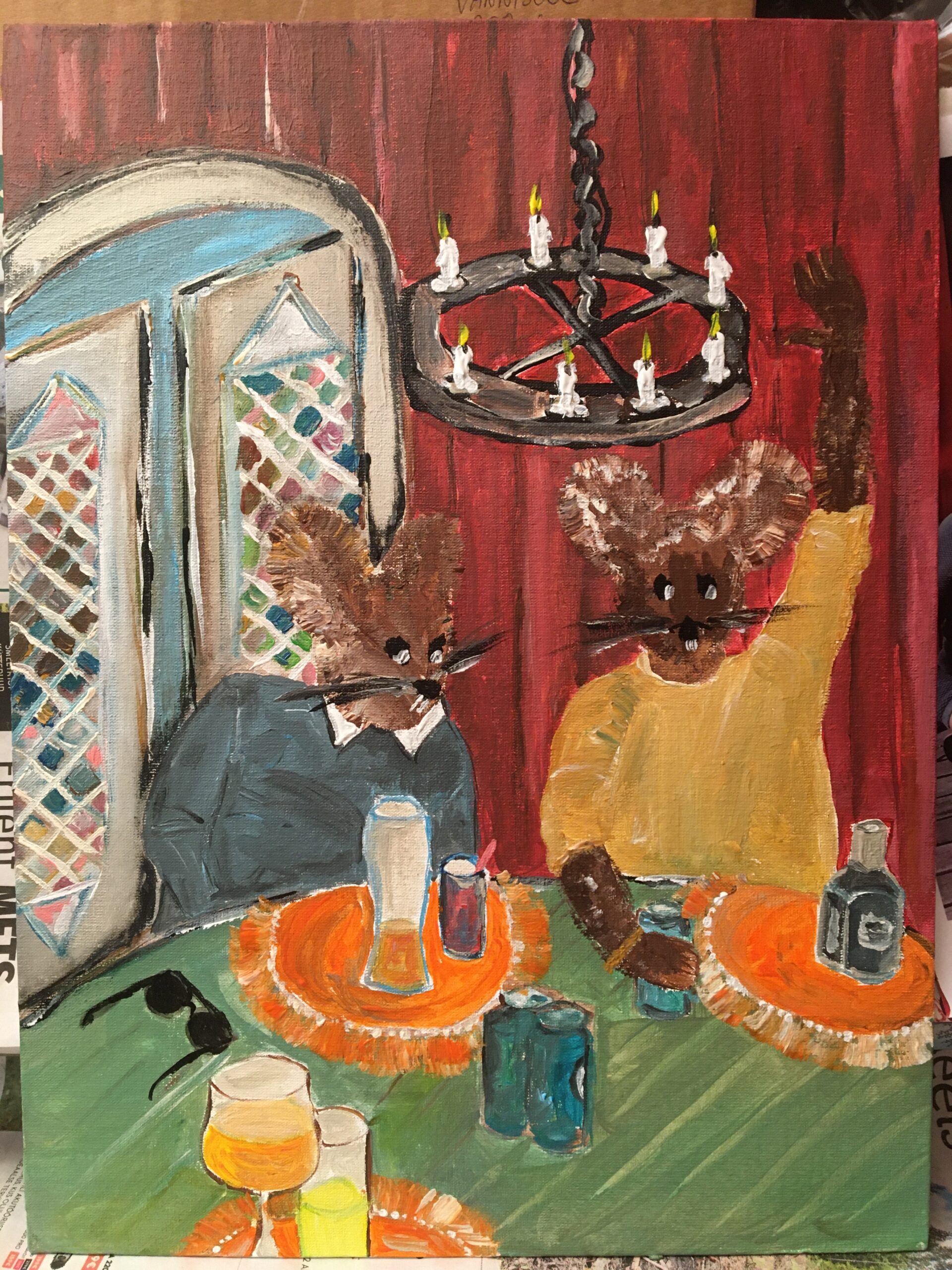 Sellel kuul olen juba kaks maali teinud – esimesest, kus hiirepoiss Ivar Apodemus lund lükkab, kirjutasin oma NordenBladeti blogis (vt. SIIT), oma ElishevaShoshana.com kunstiblogis (vt. SIIT) ning OHMYGOSSIP lehel (vt. SIIT). Eile õhtul lõpetasin taas uue maali (Tema Kõrgeausus Hiir Esimene – nr. 16). Sellel on kujutatud kahte hiirt kõrtsis. Olen täiega entusiasti ning powerit täis ning mida rohikem teen ja toimetan, seda rohkem veel tuleb energiat. Lugesin hiljuti Merit Raju raamatut “Elu uus tase – Tõuse elevusega. Ela isuga. Maga rahuga“. Elu on tõesti uuel tasemel, kui tegeleda enda arenguga, unistada ja unistusi ka teoks teha, anda endast parim ning kui on julgust olla nähtav, aus, armastav, vaba ja loov. Mina võin täna seda kõike enda kohta öelda – ma ärkan suure õhina ja õnnetundega ning magama lähen rahulolevana!