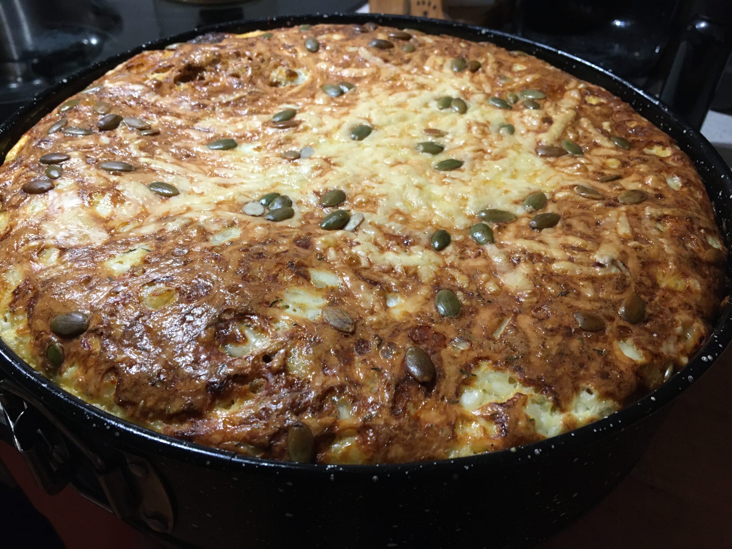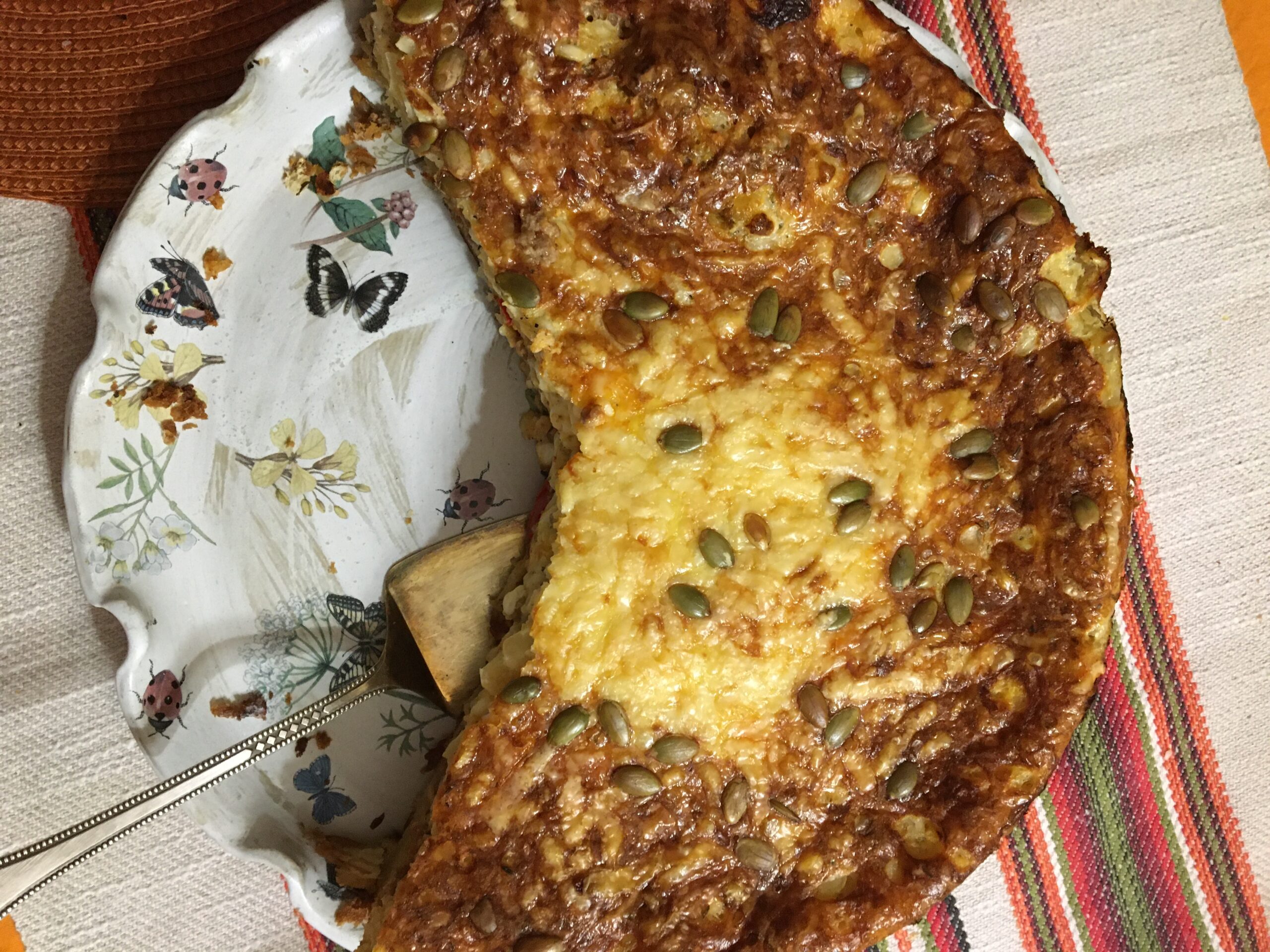 Seejärel võta kauss ja sega kokku hakitud mugulsibul, Alma klassikaline 5%-line kodujuust (380g), 6 muna, 1 supilusikatäis jahu ning riivitud Atleet juust (ca 250g) ning kalla põhja peale. Koogi keskele riivi eraldi veel natuke juustu ja puista peale kõrvitsaseemneid. Peale ahjust välja tulekut lase tunnike-kaks seista.