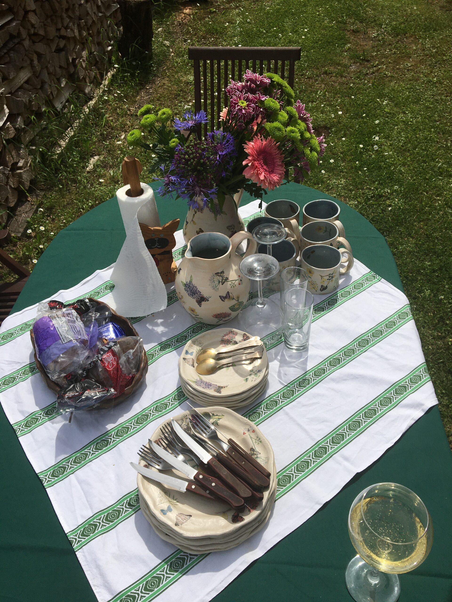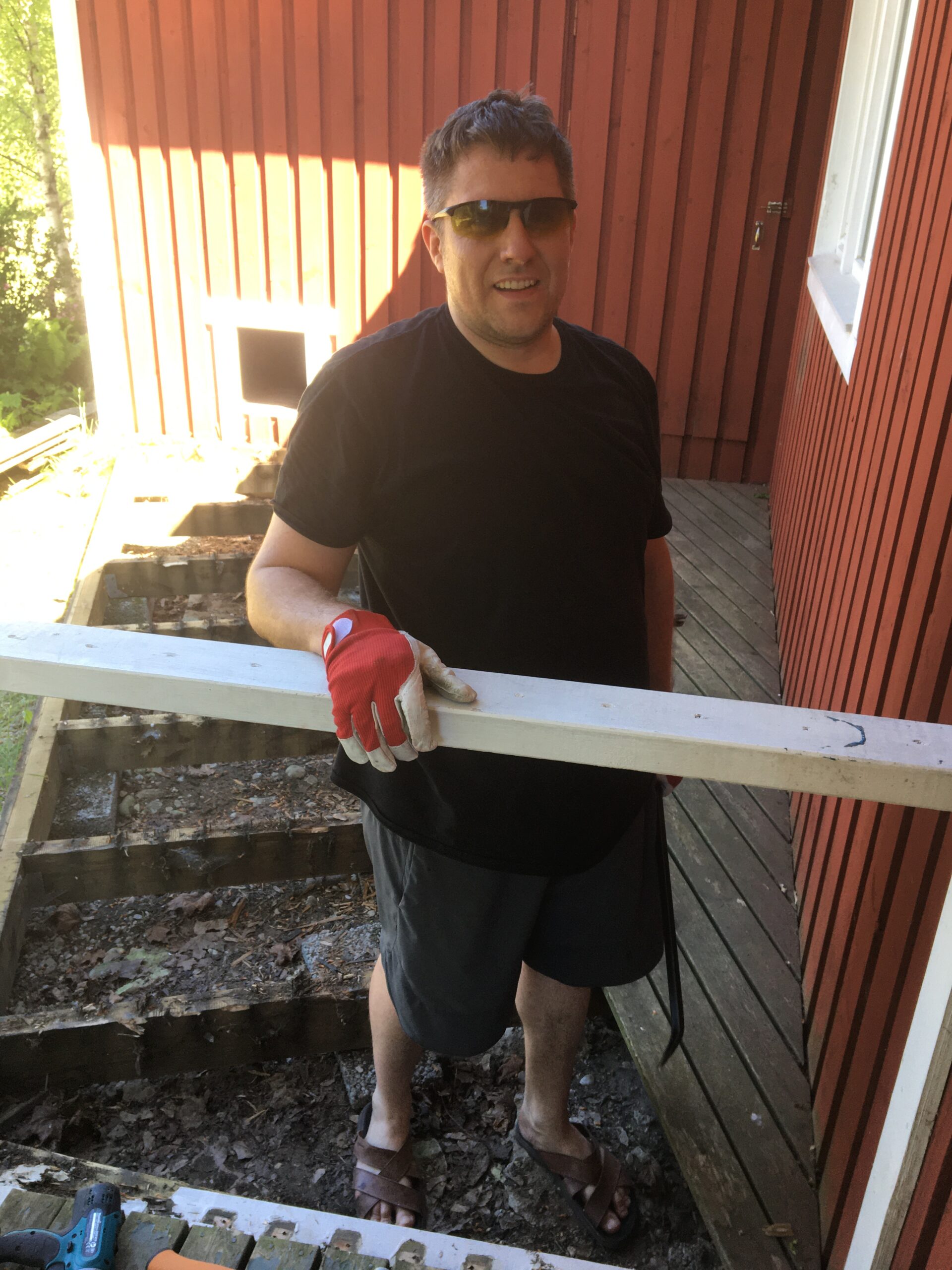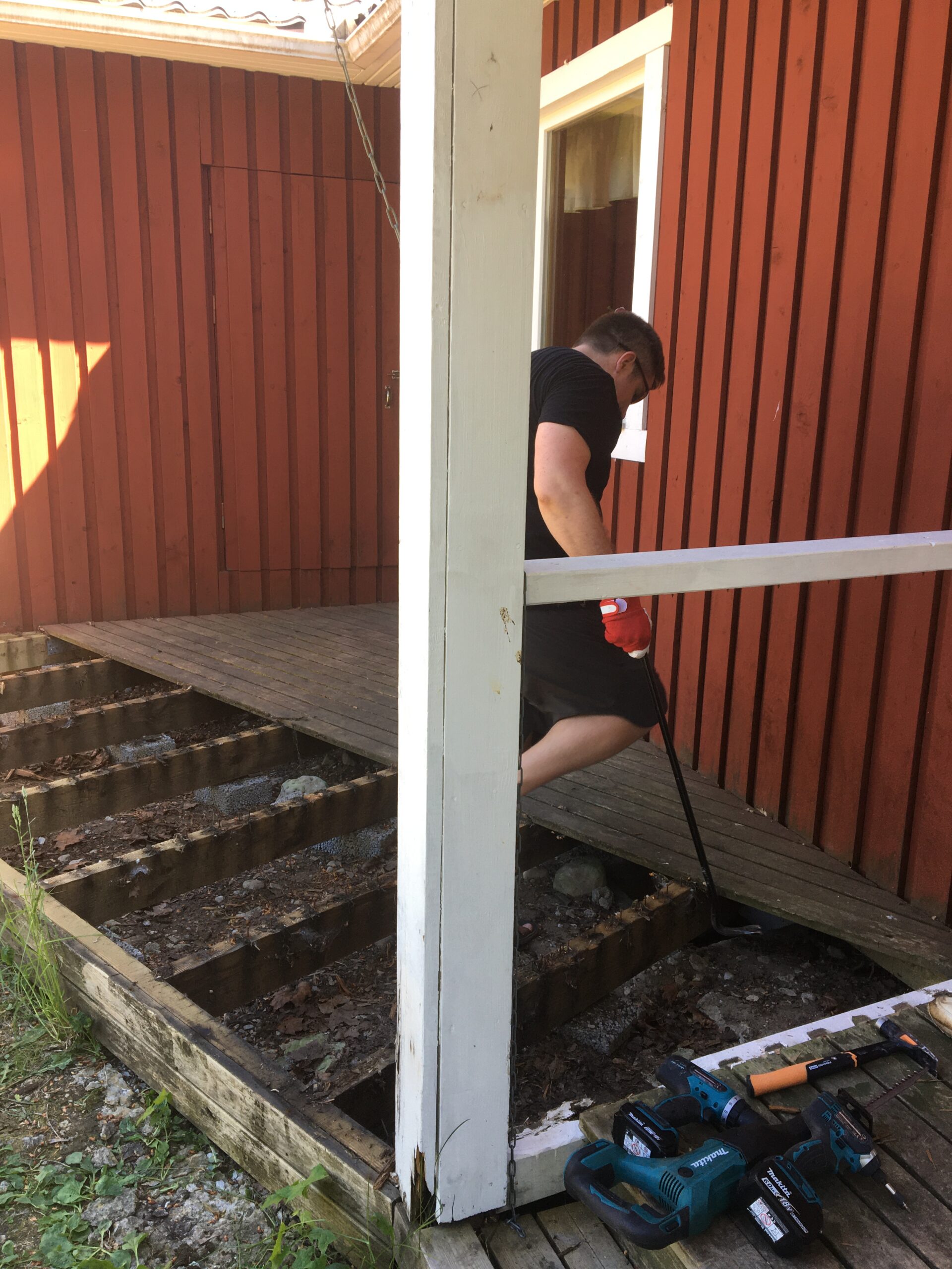 Hommikul läksid lapsed Margusega kolmeks ööks (pühapäevani) Saaremaale. Peale seda hakkasime aias toimetama. Mina rohisin ja niitsin ning Allan lammutas majaesist terrassi. Maja vajab vundamendi soojustamist ning ühtlasi saab siis teha millalgi ka uue terrassi. Rügasime mõned tunnikesed aias päikese käes (ilm on mega – mingi 30 kraadi sooja!) ja siis hakkasin Jaanipäevaks salatit tegema ning õue lauda katma. Lõunast tulid meile ka minu vanemad ja noorem õde Hanna-Liisa.