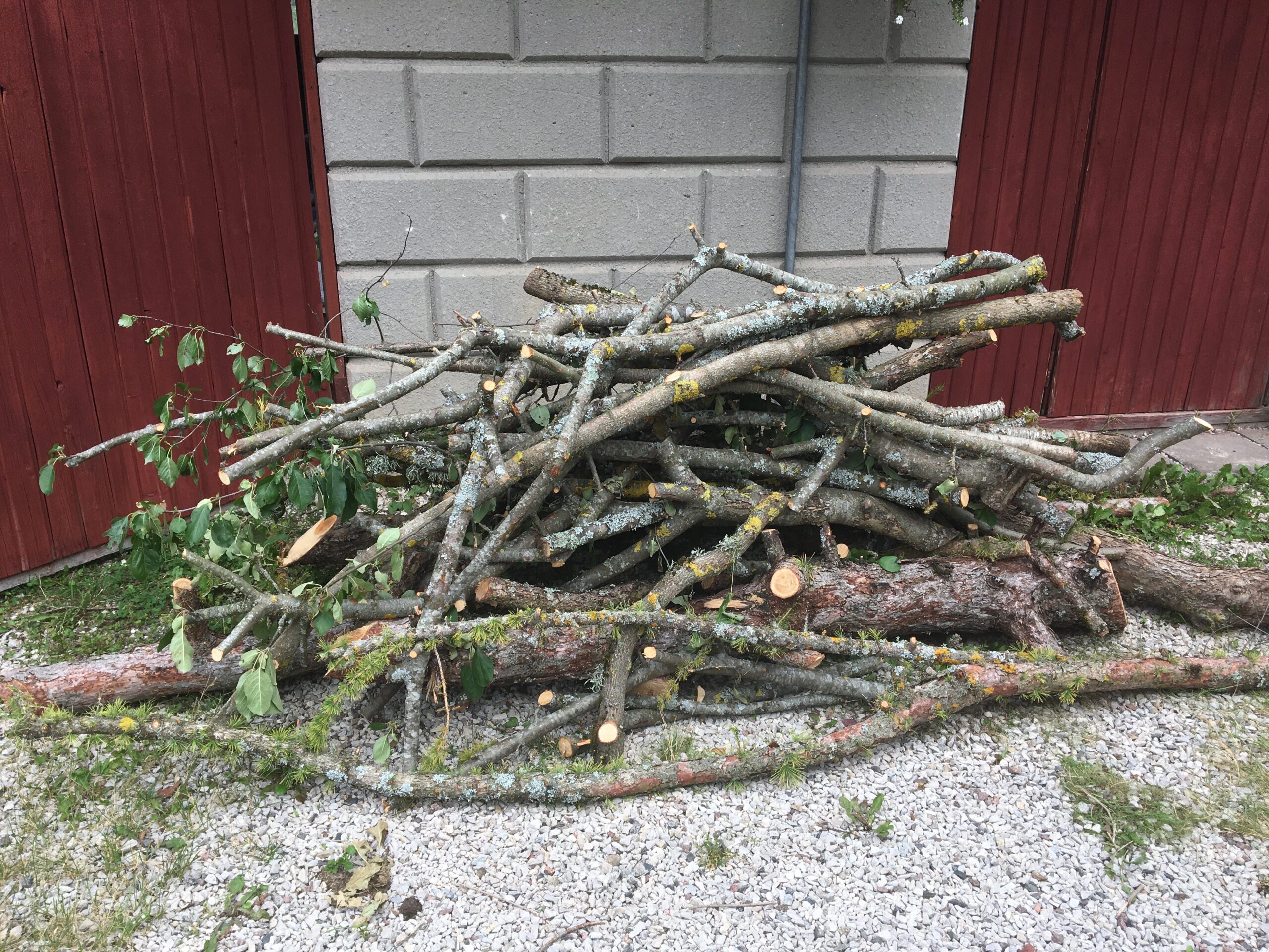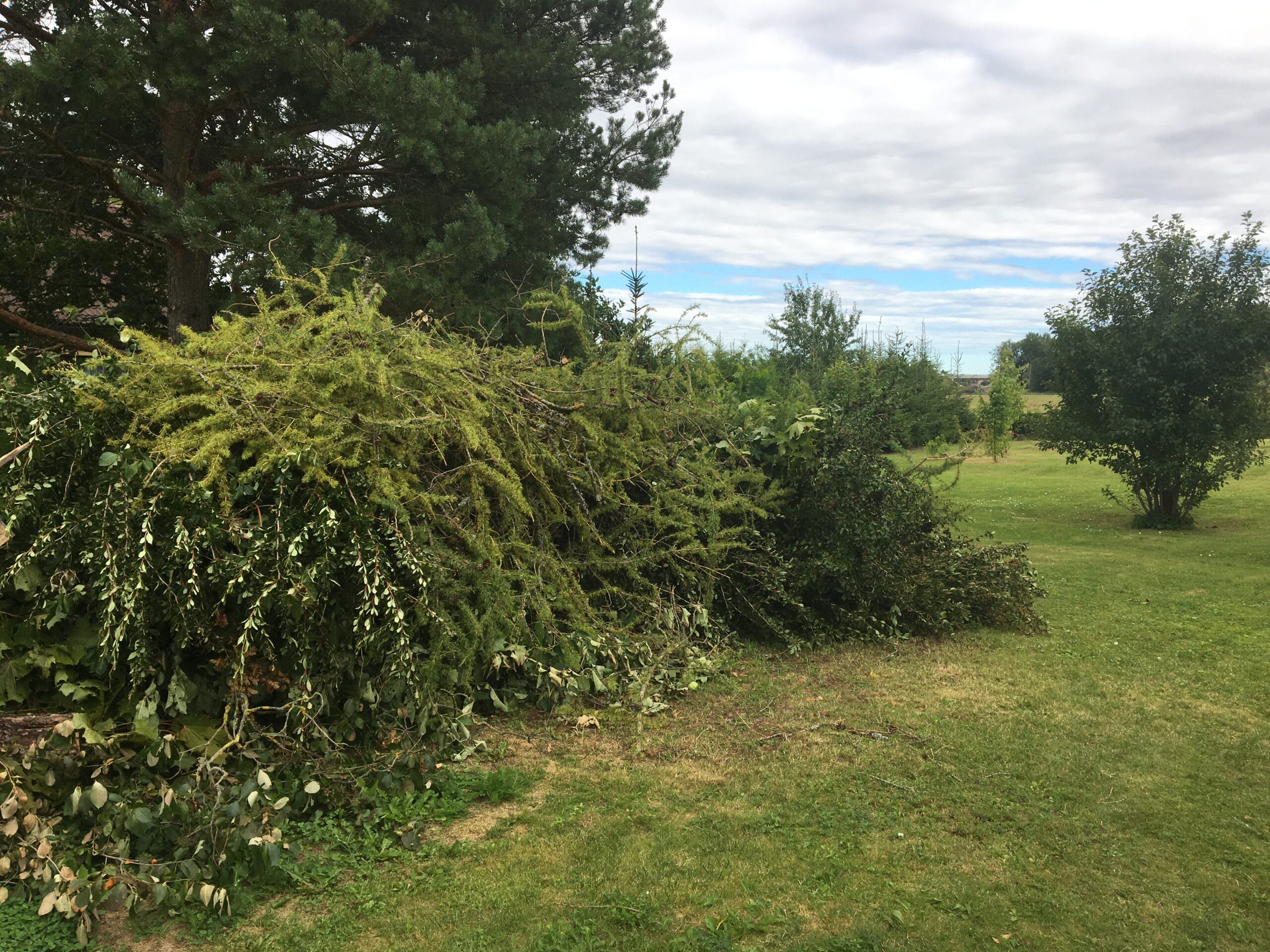 Niitsime, trimmerdasime, kitkusime umbrohtu, langetasime mitu puud (ühe õunapuu ja ühe vana männi) ja võtsime maha ühe keset aeda asunud arooniaheki ning mitmed põõsad. Põletamiseks tuli meeletu hunnik materjali, pluss osad oksad tahaks multšiks teha ning suuremad tüved panime kuivama, et ühel ilusal päeval nendest ise käsitööna endale roikamööblit valmistada. Allan lõikas parajaks ja immutas ka maja akende ümbruseks mõeldud puitu. Tahame akende ümbrused ära soojustada ning pärast paneme akende ümber uued lauad. Palju tööd sai tehtud ning palju tööd sai juurde tekitatud – näiteks hunnik kände, mis tuleb välja juurida. Praegu juurdlen, kas rentida või osta endale päriseks puiduhakkur (oksapurustaja), mis aitab oksarisust koduaia tarvis multši toota.