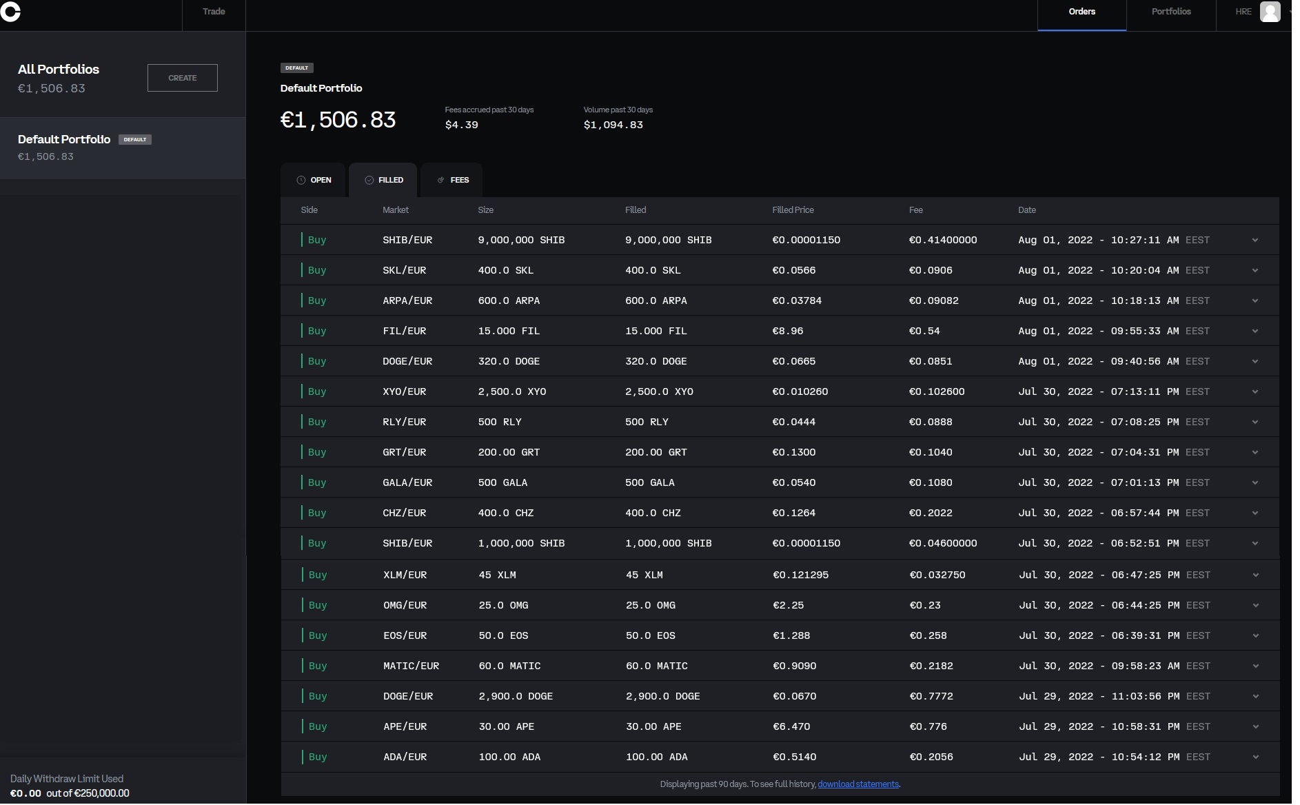 Krpüto-kauplemisega mul varasem kogemus puudub. Olen investeerinud krüpto platvormidesse aga mitte krüptosse endasse. Nüüd otsustasin sellega algust teha. Tegin endale Coinbase Pro konto ja ostsin esialgu 1500 euro eest järgnevaid krüptorahasid: ApeCoin (APE), Dogecoin (DOGE), Filecoin (FIL), Shiba Inu (SHIB), EOS (EOS), OMG Network (OMG), Chiliz (CHZ), Polygon (MATIC), Cardano (ADA), Gala (GALA), ARPA Chain (ARPA), The Graph (GRT), SKALE Network (SKL), XYO (XYO), Rally (RLY) ja Stellar (XLM). Rahuldamata orderid on veel sees: Polkadot (DOT), Tether (USDT), Liquity (LQTY) ja Mirror Protocol (MIR).