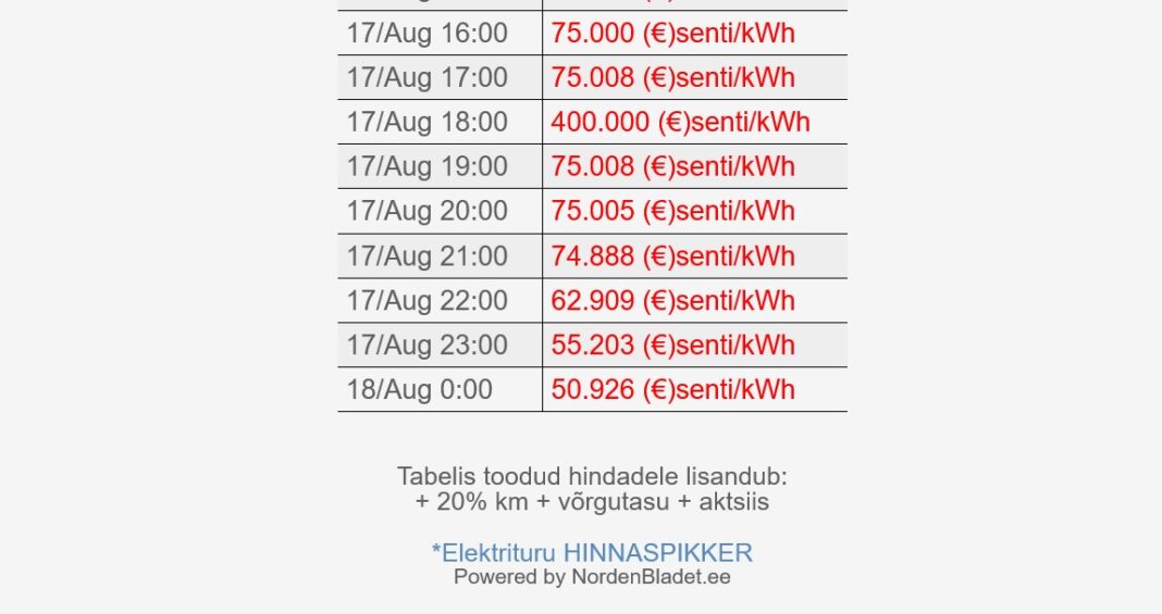 NordenBladet — Täna, kolmapäeval, 17. augustil hüppab elektri hind Eestis koguni 4000 euro peale MWh eest. See on uskumatu tase. Elektri hind kerkib 4000 euro peale MWh vahemikus kell 17-18. See on nii uskumatult kõrge hind, et sel ajal on mõistlik elekter üldse välja lülitada neil, kes börsihinnaga elektrit kasutavad.