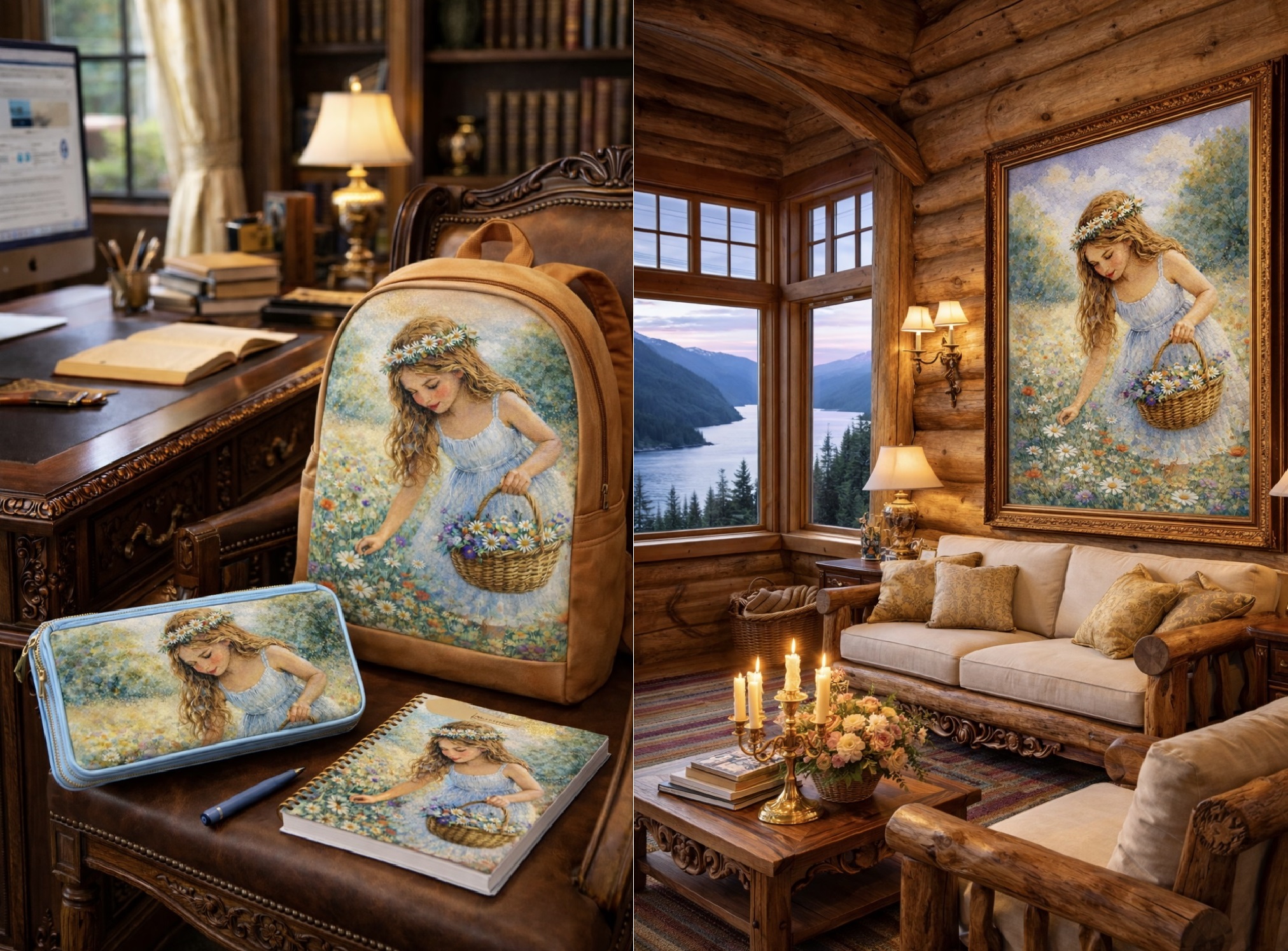 Tulemus oli nii romantiline, et katsetasin edasi – kujundasin terve “A Meadow Girl” maalil põhineva sarja – märkmikud, kotid, pinalid, serviisid, hooldussarja, pakendid jne. Ühest kunstiteosest koorus terve maailm täis huvitavaid esemeid!! Hele versioon on selline nö. nunnuduse klassika ja lillal põhjal rohkem “mystical-magical”. Ma ise küll ostaks neid ..hahaa 😀