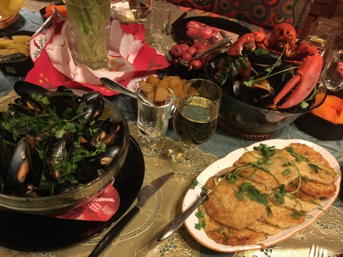 Homaar ehk merivähk; hõrgud sinikarbid spetsiaalse vürtsika ürdise veinikastmega; koriandri, tilli ning pipraga maitsestatud krevetid; imeline suitsuangerjas; kalamari maitsvate kartulikotlettidega (Latkes), mida serveeriti koos hapukoore ning sibulaga; kerge mereannisupp jne. Lisaks salatid (kartuli-lihsasalt, kõrvitsasalat, kirssõunad jne.) külalistele, kes mereande ei armasta. My-oh-my!! Nii super!